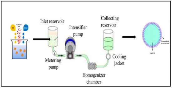 Nanoemulsions can be defined as thermodynamically unstable nanodroplets made by two immiscible liquids (oil in water or water in oil), with the average droplet size ranging from 1 to 500 nm. The nanosize has useful benefits such as high surface area, stability, transparent appearance, and tunable rheology. Nanoemulsions have exciting applications in diverse areas, including foods, pharmaceuticals, nutraceuticals, drug delivery, flavors, antioxidants, cosmetics, firefighting, and material synthesis [9,10,11]. Usually, the lipid phase is dispersed in an aqueous phase of the emulsion, and each oil droplet is being surrounded by a thin interfacial layer of emulsifier molecules [10,12,13]. These nanosized particles are stable to gravitational separation due to Brownian motion effects, and they have excellent stability against droplet aggregation due to the range of repulsive forces between the droplets and particles [13]. Several methods such as emulsification–evaporation, emulsification–diffusion, solvent displacement, and precipitation have been extensively used to prepare lipophilic functional substances with particles in the nanosize range by using high- or low-energy methods [12]. The high-energy methods use high mechanical energy, which produces more controlled sizes and compositions of the materials. However, some chemicals are easily degraded during preparation. On the other hand, a low-energy method requires low energy for the production of the nanoemulsion, and it depends mainly on the internal factors of the surfactants and the oily phase [14].