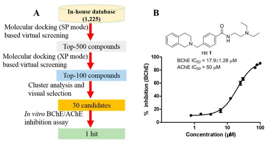 In silico screening procedure and ChE assay results of hit 1. (A) The discovery workflow of the hit compound. (B) Chemical structure of hit 1 and its ChE inhibitory activity.
