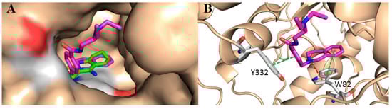 Proposed binding mode of hit 1 with BChE. (A) The predicted orientation of 1 (carbon in magenta) in the active pocket of BChE (PDB: 4BDS) with tacrine as ligand in green color; (B) The key interactions of 1 with residues in the active sites of BChE. π-π stacking and cation-π interaction are displayed in green and red dashed lines, respectively.