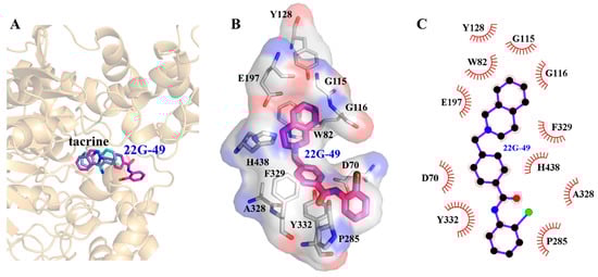 A probable binding mode of 23 with BChE was obtained by conducting molecular docking. As illustrated in Figure 4A, compound 23 could well occupy the tacrine binding site and displayed similar binding mode with tacrine. In addition, the bromophenyl of 23 extended outside of tacrine binding site. As we can see from Figure 4B,C, the binding pocket of 23 was a hydrophobic pocket composed of D70, W82, G115, G116, Y128, E197, P285, A328, F329, Y332, and H438 residues, and the π-π interactions of 23 with W82 and Y332 were retained. Hydrophobic interaction is the main interaction in stabilizing 23 to the tacrine binding site.