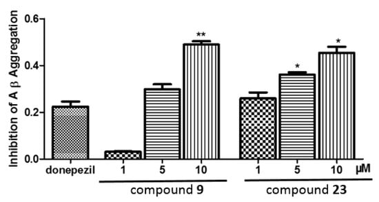 Inhibitory activity against Aβ1-42 produced by 9 (1, 5, 10 μM), 23 (1, 5, 10 μM), and donepezil (10 μM). Data are shown as mean ± SD (n = 3), with * p < 0.05 and ** p < 0.01 versus donepezil.