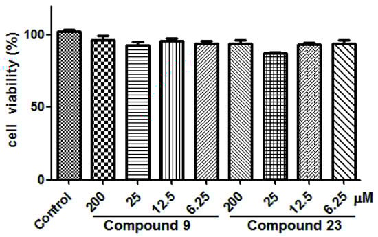Next, to determine the potential cytotoxic activity of selected compounds 9 and 23 towards SH-SY5Y neuroblastoma cells, the viability of cells treated by 9 and 23 was evaluated by MTT assay. The result presented in Figure 6 revealed that both compounds did not show obvious cytotoxicity in the range of tested concentration, even at 200 μM.