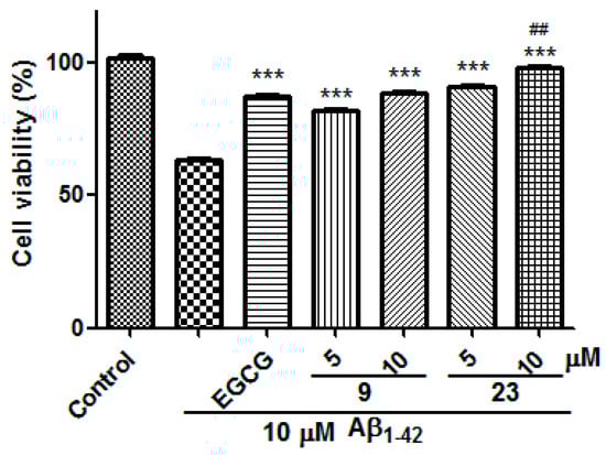 Protective effects of compounds 9 and 23 on Aβ1-42-induced toxicity in SH-SY5Y cells. Data are expressed as mean ± SD (n = 3), *** p < 0.001 versus Aβ1–42 treated only, and ## p < 0.01 versus positive control EGCG.
