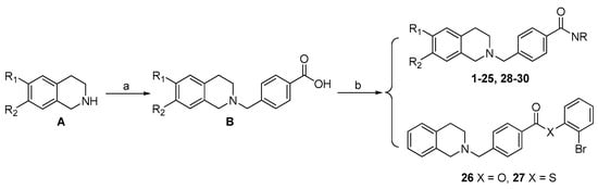 To improve the potency of hit 1 and to discuss the structure-activity relationship (SAR), a range of amide and ester derivatives of 4-((3,4-dihydroisoquinolin-2(1H)-yl)methyl)benzoic acid were designed and synthesized based on molecular docking analysis. The synthetic route outlined in Scheme 1 started from the commercial tertrahydroisoquinoline or its derivatives A, which reacted with 4-(bromomethyl)benzoic acid to give intermediates B. Subsequent condensation reaction of acids B with various alkyl amines, aromatic amines, phenol, thiophenol or tryptamines smoothly yielded the target compounds 1–30.