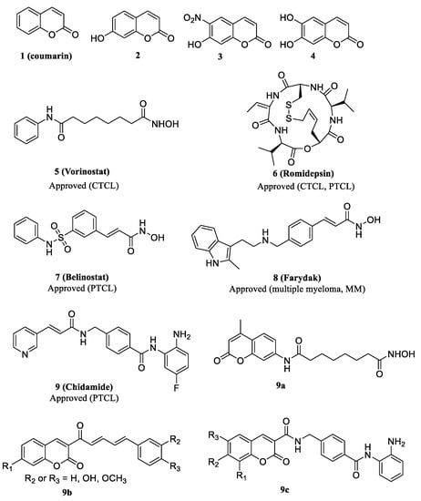 Structures of representative coumarin derivatives, FDA-approved histone deacetylase (HDAC) inhibitors and coumarin-based HDAC inhibitors.