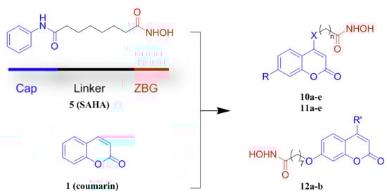 HDACis have been employed in a number of efforts to generate hybrid agents with the purpose of achieving synergistic effects [27]. Several coumarin-based HDAC inhibitors (9a, 9b and 9c) (Figure 1) were designed and demonstrated the validity of such a design strategy to develop novel HDACis [28,29,30]. The only hydroxamate HDACi 9a was just synthesized as a fluorescent probe for determining the binding affinities (Kd) and the dissociation off-rates (Koff) of the HDAC-inhibitor complexes, while the antitumor activities associated with this compound were not studied. Therefore, in the present study, we incorporated coumarin into hydroxamate HDACis, and a series of new coumarin-based hydroxamate HDACis were then synthesized. The rationale for the design of these compounds is illustrated in Figure 2. We attempted the use of a substituted coumarin moiety as a CAP group for enzyme surface interactions, different carbon chains as a linker region, and a hydroxamic acid group as the ZBG. The synthesized compounds were evaluated for their inhibitory activities against HDAC1. The cytotoxicity against three different cancer cell lines, including A549 (adenocarcinoma human alveolar basal epithelial cells), Hela (human cervical cancer cell) and HepG2 (human liver cancer cells), were also conducted. Docking studies were performed to explore the interaction between selective compounds and HDAC1.
