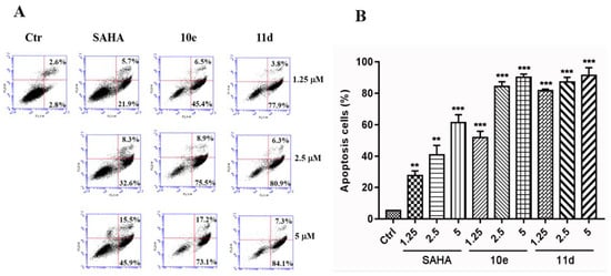 To investigate whether the potent anti-proliferative activities of compounds 10e and 11d were related to enhancing the apoptosis of cancer cells, we carried out an annexin V fluorescein isothiocyanate (FITC)/propidium iodide (PI) binding assay in A549 cancer cells. As shown in Figure 4A, compounds 10e and 11d caused a significant induction of apoptosis in a dose-dependent manner. 10e and 11d induced 51.9% and 81.7% apoptosis in A549 cancer cells at 1.25 μM, induced 84.4% and 87.2% apoptosis in A549 cancer cells at 2.5 μM and induced 90.3% and 91.4% apoptosis in A549 cancer cells at 5 μM, respectively. However, SAHA only induced 27.6%, 40.9% and 61.4% of apoptotic cells at 1.25, 2.5 and 5 μM, respectively. The quantitative analysis results indicated that 10e and 11d were able to induce more apoptosis in A549 cells than the positive control drug, SAHA (Figure 4B).