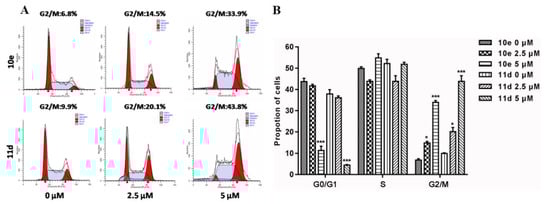 Next, we investigated whether the potent anti-proliferative activity of 10e and 11d resulted from the induction of the cell cycle arrest. As shown in Figure 5A and 5B, 10e and 11d led to a significant induction of the G2/M phase cell cycle arrest in a concentration-dependent manner. This was evidenced by the increasing percentages of cells in the G2/M phase, accompanied by a proportionate reduction in other phases of the cell cycle.