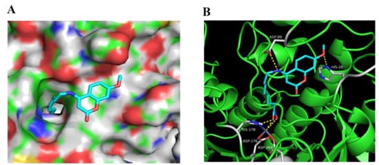 In order to determine the interaction mode between our compounds and HDACs, molecular docking was performed using a validated molecular dock program (AutoDock 4.27) [36]. Compound 10e was docked into the active site of HDAC1 (PDB entry: 4BKX) (Figure 6). The results showed that 10e had a similar binding mode to SAHA in the active site of HDAC1: the cap group interacts with the residues of the entrance region, the linker goes through the hydrophobic channel, and the hydroxamic acid could chelate the catalytic zinc ion (Figure 6A). Compound 10e could form five hydrogen bonds with ASP99, HIS28, HIS178, ASP176 and ASP264 residues in the active site of HDAC1 (Figure 6B). It should be noted that the 7–methoxy group on the coumarin ring of compound 10e docked into the hydrophobic pocket of the protein, which could account for the potency of this compound (Figure 6A).