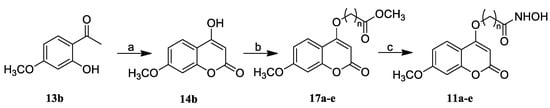 The routes used for the synthesis of the target compounds containing the coumarin moiety are shown in Scheme 1, Scheme 2 and Scheme 3. As depicted in Scheme 1, the intermediates 14a,b were synthesized from 2–hydroxyacetophenone derivatives 13a,b by reacting with diethyl carbonate and sodium hydride (NaH) at 100 °C [31]. After the chlorination, 4–chloro coumarins 15a,b were further condensed with different amino acid esters in ethanol (EtOH) to yield esters 16a–e according to procedure c, which were then reacted with freshly prepared hydroxylamine (NH2OH) in methanol (MeOH) to give the target compounds 10a–e.