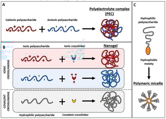 Types of polysaccharide-based nanoparticles depending on their components, the interactions between them and their final structure: polyelectrolyte complex (A); nanogel (B); and polymeric micelle (C).