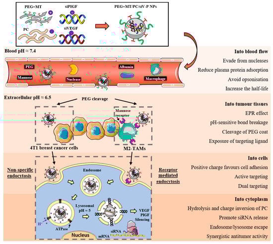 Schematic illustrations of the preparation of modified chitosan nanocarriers and their antitumor efficacies overcoming the systemic and intracellular delivery barriers for the synergistic delivery of two siRNAs. The nanoparticles were synthesized using polyethylene glycol (PEG) and mannose doubly modified trimethyl chitosan (PEG = MT) along with citraconic anhydride grafted poly (allylamine hydrochloride) (PC). Adapted from [] with permission from Elsevier.