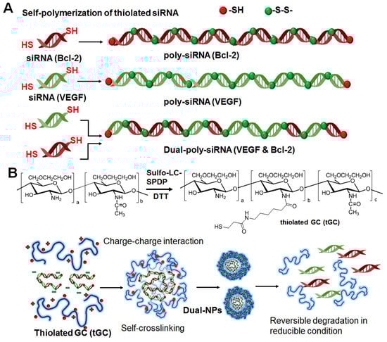 Schematic illustration of co-delivery of VEGF and Bcl-2 siRNAs using the dual-nanoparticle (dual-NP) system. Dual-poly-siRNA (A) was incorporated in the thiolated glycol chitosan (tGC) to form nanoparticle structures (dual-NPs) through the charge-charge interaction and chemical crosslinking (B). Adapted from [] with permission from Elsevier.
