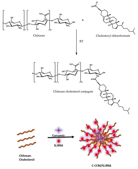 Chitosan can be modified with hydrophobic moieties for the formation of a polymeric micelle where hydrophobic drugs can be encapsulated into the core. The hydrophobic moieties most frequently used are lipophilic acids, such as lipoic acid [], cholanic acid [] or palmitic acid [], and cholesterol []. Figure 5 shows the structure of a cholesterol-grafted chitosan micelle developed for drug–siRNA co-delivery to cancer cells []. siRNA is complexed within the chitosan hydrophilic shell while curcumin is loaded into the hydrophobic core of the nanocarrier.