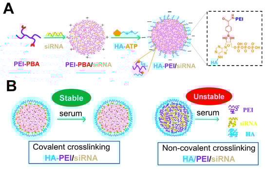 While some researchers prefer to associate hyaluronic acid to polycations by electrostatic complexation on the argument that chemical modification could disturb the functionalities of native hyaluronic acid [], others prefer to chemically modify hyaluronic acid by conjugating it to cationic groups or polymers that confer the positive charge needed for siRNA complexation []. This covalent attachment could result in a more stable and permanent availability of hyaluronic acid in siRNA nanocarrier compared to pH-dependent electrostatic complexation []. Zhou and co-workers demonstrated the superior colloidal stability of the covalent conjugate HA-PEI in the presence of serum and phosphate in comparison to non-covalent polyplex HA/PEI []. Moreover, they used a reversible covalent crosslinking that allowed the controlled release of siRNA in the ATP-rich environment of cytosol and significantly improve siRNA silencing (Figure 6). Note that in this review, following the standard nomenclature used in literature, covalent linking between HA and a polycation is referred as HA-polycation and non-covalent linking is denoted as HA/polycation.