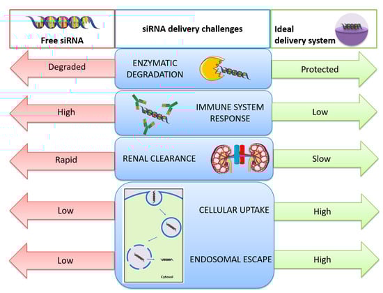 Nevertheless, the lack of success of siRNA-based formulations as therapies resides in the challenges facing the in vivo delivery of siRNA. Unmodified siRNA is rapidly degraded by endogenous nucleases and induces the innate immune response. Chemical modification of siRNA structure has been found to be a possible strategy that can prevent both enzymatic degradation and immunogenicity, as well as to reduce off-target effects []. However, there are some other issues that such modifications cannot solve: the rapid renal clearance after systemic administration due to the relatively small size of siRNA (compared to the effective glomerular pore size), and the inability of RNA to cross the hydrophobic target cell membrane as a result of its hydrophilicity, negative charge, and too high molecular weight. This means that the development of safe and effective delivery systems that can protect siRNA and facilitate its transport into the cytoplasm of target cells can be decisive in obtaining a more successful application of siRNA-based therapies []. An ideal carrier for siRNA delivery should possess the following three fundamental attributes: (1) it should efficiently bind siRNA to maintain its stability in physiological media by providing protection against enzymatic degradation; (2) the association with a carrier should help to avoid siRNA clearance by the mononuclear phagocyte system and to enhance the intracellular uptake; and (3) the siRNA–carrier complex should display endosomal escape into the cytosol and produce a sustained release of siRNA without causing toxicity or activating the immune system []. The numerous problems related to the in vivo delivery of siRNA and solutions potentially provided by nanocarriers are summarized in Scheme 1.
