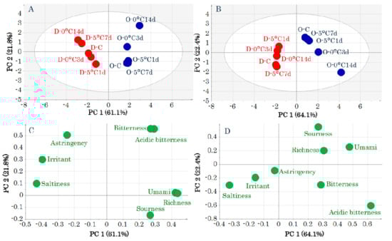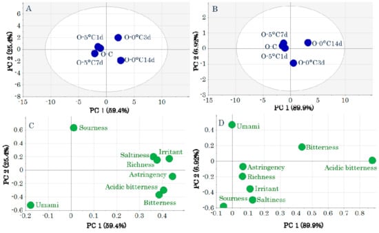 In contrast, in the OM score plot, the samples before storage and storage at 5 °C are to the left of the first principal component and 0 °C storage is to the right. The before storage and 5 °C storage groups were indistinguishable because of their overlapping positions (Figure 3A,B). This indicates that the taste attributes after 5 °C and 0 °C storage differed. Most taste attributes were related to 0 °C storage (Figure 3C,D).