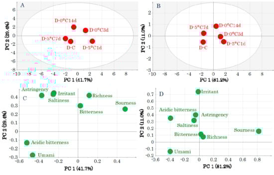 Subsequently, PCA-Y was performed for both muscle types to evaluate the effects of storage on the taste attributes (Figure 2 and Figure 3). In the DM score plots, the samples before storage are shown lower left of the center, and there was no significant effect of storage (Figure 2A,B). The loading plots (Figure 2C,D) show that samples before storage were related to “umami.”