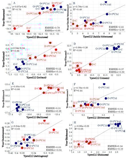 Regression analyses of the predictive model for each y variable. (A) Sourness. (B) Acidic bitterness. (C) Irritant. (D) Umami. (E) Saltiness. (F) Bitterness. (G) Astringency. (H) Richness. Symbols indicate sample IDs (Table S1). RMSEE, root mean square errors of estimation; RMSEcv, root mean square errors of cross-validation.