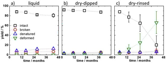 Yields of intact, broken, denatured, and deformed DNA origami depending on the age of the staple solution for (a) measurements in liquid, (b) measurements using the dry-dipped protocol, and (c) measurements using the dry-rinsed protocol.