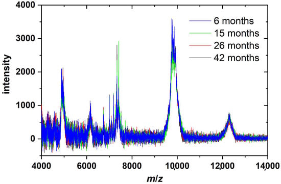 MALDI-TOF mass spectra of all four staple sets that differ in age from 6 to 42 months.