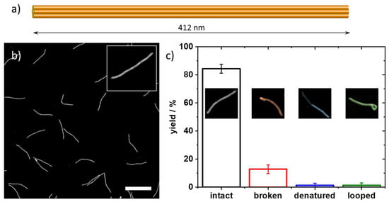 (a) Schematic illustration and (b) AFM image of DNA origami 6HBs assembled from 56-month-old staples after rinsing. The scale bar and height scale are 500 and 2.0 nm, respectively. The inset shows a zoom of an individual 6HB. (c) Corresponding yields of intact, broken, denatured, and looped DNA origami 6HBs. The insets show examples of the individual categories. Scaffold age at the time of use was one month.