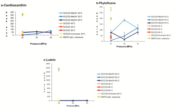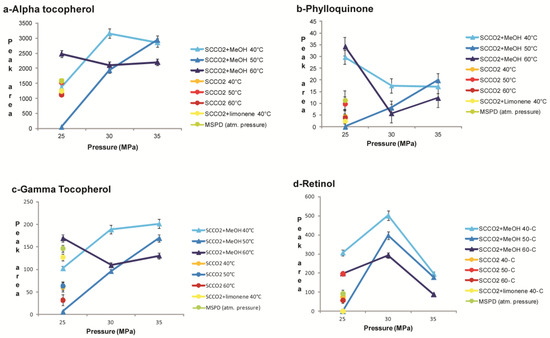 Retinol, or vitamin A, as a metabolite of provitamin A carotenoids, could be formed during the extraction procedure by increasing the extraction temperature. In fact, in almost all the SCCO2 extraction conditions tested, a larger recovery of this vitamin was observed when compared to the MSPD technique (Figure 1d).