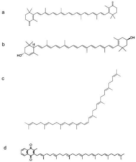 Chemical structures of: (a) canthaxanthin, (b) lutein, (c) phytofluene, and (d) menaquinone-7.