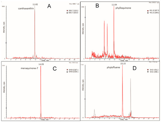 LC-MRM profile of canthaxanthin (A), phylloquinone (B), menaquinone-7 (C), and phytofluene (D) extracted from a microalga sample by SFE. Extraction conditions: A, B and D: PCO2 = 35 MPa, TCO2 = 40 °C, 5% MeOH. C: PCO2 = 10 MPa, TCO2 = 40 °C.