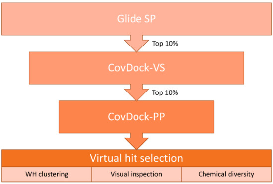Targeted covalent inhibitors form chemical bonds with protein residues. Their potential advantages over noncovalent inhibitors are high potency, strong, often irreversible binding, long duration of action, and lower sensitivity to pharmacokinetic parameters [1,2]. The identification and the optimization of covalent inhibitors, however, require special considerations and methods typically not present in more conventional noncovalent drug discovery. This also holds for computational approaches supporting drug discovery efforts. The proper description of covalent bond formation poses particular challenges for computational methods. In noncovalent hit identification, virtual screening, especially structure-based virtual screening, has proven to be a successful tool to efficiently investigate large chemical libraries with 104–105 compounds [3]. Structure-based virtual screening tools have also been developed for covalent inhibitors, however, their limited throughput is not always coupled with improved quality results [4], and their prospective application to large compound collections is rare [5,6,7]. One of the limitations of covalent docking tools is the improper description of the conformational space available for a ligand covalently bound to the protein. Correctly accounting for the interplay between bonded and non-bonded interactions in the neighborhood of the newly formed covalent bond is highly challenging, and anchoring the covalent ligand at the reaction site does not necessarily improve binding mode predictions. Indeed, it was found that noncovalent docking tools can be applied to the docking of compounds forming covalent bonds with little loss of accuracy compared to dedicated covalent docking tools [4]. Taking into account the significantly higher throughput of noncovalent docking and scoring, it is appealing to build a multistep virtual screening protocol, where noncovalent docking is used to filter a large number of compounds, and then covalent docking is only applied to a limited number of pre-screened ligands. Such a procedure reflects the binding process of covalent compounds with the initial formation of the noncovalent complex before the covalent bond is formed. In the present contribution, we propose a three step protocol that starts with a noncovalent docking-scoring step to significantly reduce the number of ligands that are input into two consecutive covalent docking steps; a higher throughput and less accurate scheme is followed by a more involved calculation with higher precision, as is detailed later.