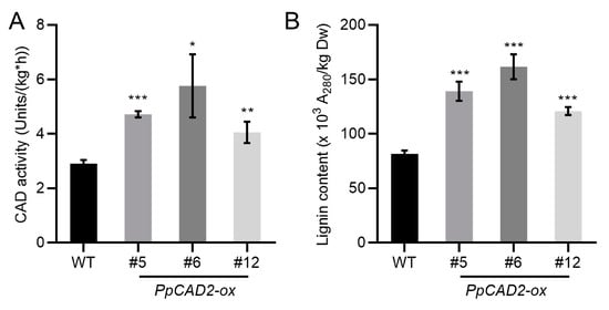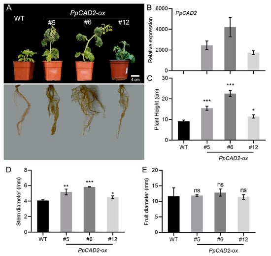 We compared the morphology of the plants from the WT and the PpCAD2-ox lines. Compared with the WT plants, the overexpression of PpCAD2 resulted in taller plants with a more extensive root system (Figure 1A). The WT plants only had a fewer and shorter roots (Figure 1A). The plant height in the PpCAD2-ox lines was significantly higher than for the WT plants (Figure 1C). Like the plant height, the stem diameter in the PpCAD2-ox lines was significantly larger than for the WT plants (Figure 1D). However, overexpression of PpCAD2 did not affect the fruit diameter (Figure 1E). In agreement with our results, in Arabidopsis, the silencing of CAD C, and CAD D resulted in a severe dwarf phenotype []. Moreover, it has been reported that Medicago truncatula CAD1 mutant cad1-1 plants exhibit a dwarf phenotype when grown at 30 °C []. In rice, CAD mutant plants also exhibit a semi-dwarf phenotype []. Collectively, these results suggest that PpCAD2 functions by increasing the plant height and stem diameter but not by affecting the fruit diameter.