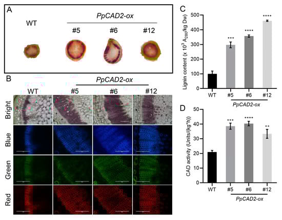 The CAD enzyme has been reported to have a key role during the lignin biosynthesis. To determine whether PpCAD2 regulates the lignin content, we examined the degree of lignification and lignin content in wild-type and PpCAD2-ox stems. The Weisner staining results showed that the level of the stem’s lignin staining was higher in the PpCAD2-ox lines than in the WT plants (Figure 2A). Overexpression of PpCAD2 results in more cell layers of xylem elements and a wider xylem tissue (Figure 2B). Observations of autofluorescence also showed that there are more cell layers of xylem elements in the stem of the PpCAD2-ox lines than for the wild type plants (Figure 2B). Then, we examined the lignin content and CAD enzymatic activity in the stem of the WT and PpCAD2-ox lines. The lignin content of the stem in the transgenic lines overexpressing PpCAD2 was significantly higher than that in WT (Figure 2C). As expected, the CAD enzymatic activity was significantly higher in the PpCAD2-ox lines than for WT (Figure 2D). These results further indicate that the CAD enzymatic activity is positively correlated with the lignin content in the stem. Overexpression of PpCAD2 increased the level of lignification of the stem tissues, suggesting that PpCAD2 may play a role in lignin accumulation in tomato stem tissues.