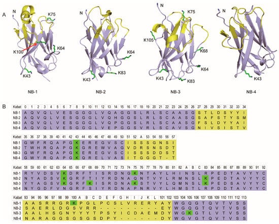 Stereoscopic structure, amino group distribution schematic (A) and sequences (B) of the selected four VHHs. The amino acid was numbered in Kabat scheme (n) instead of the real sequence number. “K” present lysine residue, “Kn” present the lysine residues located in Kabat scheme Hn, and “N” presents the N-terminal amino group.
