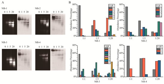 Amino modification has been criticized for its inevitable generation of heterogeneous products. The fundamental cause of isomers was the multiple amino groups in protein. Native-PAGE (Figure 2A) and LC-MS intact protein analysis (Figure 2B) were performed to detect the Fluo-antibody ratio (FAR) isomers in the modified products. In Native-PAGE, the positive charge on the surface of VHHs decreased with more amino groups modified by NHS-Fluo, resulting in higher fluorescein load isomers that move faster in gels. Unlike the clearly separated number isomers, the position isomers were more likely to form two adjacent bands or a blurry band. In order to describe in depth the FAR isomers, we analyzed the products by LC-MS to detect the percentage of different FAR components (Figure 2B) and calculated the average FAR (Table 2) of the products by intact protein analysis. As expect, it is observed that NB-3 generated most isomers than NB-1, NB-2 and NB-4. Correspondingly, the products of the modified NB-4 were relatively homogeneous. This result was consistent with the amount of amino groups in each VHH.