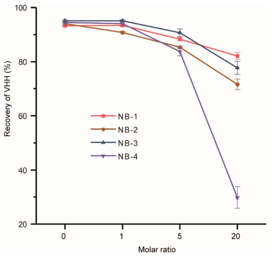 Modifications may change the surface charge and the structure of VHHs, resulted in protein aggregation. The recovery of modified VHHs was used to evaluate the stability of four selected VHHs (Figure 3). The groups of the molar ratio at zero were set as negative controls and other three different molar ratios of the recovery of four VHHs decreased to varied degrees. It could be found that the recovery of NB-4 decreased dramatically when modified by higher molar ratios of NHS-Fluo. Surprisingly, the recovery of NB-4 abnormally dropped from 82% (modified by a 5-fold amount of NHS-Fluo) to only 30% (modified by a 20-fold amount of NHS-Fluo), but the recoveries of modified NB-1, NB-2 and NB-3 remained about 80%. Our analysis could not explain precisely why the stability of NB-4 was extremely sensitive to amino modification, but we can make reasonable conjectures that the aggregation was caused by modification, suggesting structural instability compared with NB-1, NB-2 and NB-3. When it is considered that NB-4 has only one lysine residue besides the N-terminal amino group (Figure 1), and K44 also exists in other three VHHs, this phenomenon was more noteworthy.