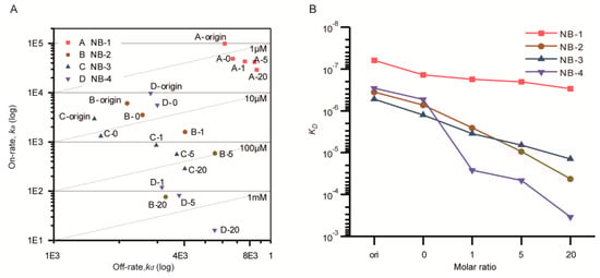 After that, the ka and kd were visualized in the double logarithm coordinate (Figure 4A). The KD were displayed using line charts (Figure 4B). The combination and dissociation sensorgrams of the modified VHHs at the same concentration were presented in Figure S1. Compared with the corresponding samples without any treatment, the KD of NB-1-0, NB-2-0, NB-3-0 and NB-4-0 about increased to two-fold, and both on-rate and off-rate were influenced, indicating that extra processing steps including incubation and ultrafiltration slightly impacted the affinity of VHHs.