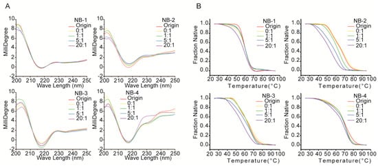 To identify the secondary structural changes resulted from amino modifications, the original and modified proteins were evaluated by far-UV CD spectra (Figure 5A). On the one hand, the far-UV CD spectra of all VHHs had positive peaks in the range of 200–205 nm and negative peaks in the range of 210–225 nm, and the latter is a characteristic of β-sheet structure predominantly found in immunoglobulins. On the other hand, the differences between the far-UV CD spectra of four VHHs were shown clearly, indicating the difference among the secondary structures of each VHH or the original and modified VHHs. For the spectra of NB-1, there is no significant difference between the five groups, showing no substantial changes in the secondary structure among original or modified Nb-1. NHS-Fluo had no significant effect on the structural properties of NB-1. When modified by increased molar ratios of NHS-Fluo, the spectra of NB-2 were accompanied by a faint red shift (2 nm) around 216 nm, and a simultaneous flattening of the spectra from 230 nm to 240 nm. These are evidences on slight conformational changes of NB-2, affected by NHS-Fluo. The spectra of modified NB-3 did not change obviously and has no significant shift or peak, indicating NB-3 is more stable than NB-2. The spectra of modified NB-4 were more dissimilar than those of NB-1, NB-2 and NB-3. On one hand, like NB-2, the peak at 216 nm shifted slightly and the spectra flattened out from 230 nm to 240 nm. On the other hand, the positive peaks around 200 nm were dissimilar. It was clear from the drastic changes in the spectra that the amino modification affected the structure of NB-4 significantly. It is important to note that these results are consistent with the decrease of stability and bioactivity resulting from amino modification (Figure 3 and Figure 4).