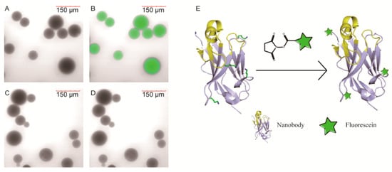 Labeled NB-1 stained beads visualized by laser scanning confocal microscope. (A,B) were β2m coated beads, (C,D) were BSA coated beads, (A,C) were bright field images, and (B,D) were merged images, (E) was the schematic diagram of VHHs modified by NHS-Fluo.