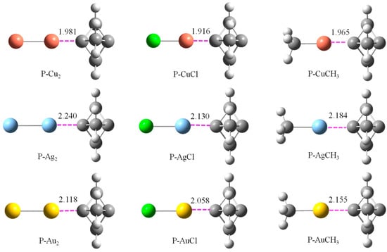 The attractive interaction between both molecules can be understood with the MEP maps as shown in Figure 2. Obviously, there is a red region (σ-hole) along the M-M, M-Cl, and M-C bonds. The σ-hole was enlarged in sequence of Ag2 < Cu2 < Au2, AgCl < AuCl <CuCl, but AuCH3 < AgCH3 < CuCH3. The MEP of the σ-hole increased in the order M2 < MCH3 < MCl owing to the different electron-withdrawing ability among the Cl, CH3, and M. The bridgehead carbon atoms in P have negative MEPs (see the blue area of P in Figure 2). As a result, a coinage-metal bond formed between the bridgehead carbon atom of P and the M atom in M2/MCl/MCH3.