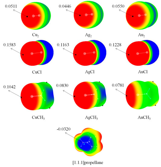 Regium bond is a strong interaction that occurs between a σ-hole on a coinage-metal (regium) atom and an electron donor [8]. Before this name was proposed, the Lewis acidic character of a regium atom had long been recognized [9,10,11], where the corresponding interaction was called gold-bonding. Regium bonds between Mn clusters (M = Cu, Ag, Au; n = 2–6) and nucleophiles NH3 and HCN are in a large part dominated by Coulombic attraction, with a smaller orbital interaction contribution [12]. Other than molecules with lone-pair electrons, π molecules are also utilized to bind with regium nanoparticles [13,14] and gold compounds [15]. If MX (X = halogen) binds with benzene, a cation-π interaction is characterized since the oxidation state of M is +1 in MX [14]. Recently, Legon and Walker named this bond as a coinage-metal bond by analogy with the term ‘halogen bond’ [16]. Wang et al. compared the hydrogen, halogen, and coinage-metal bonds between small π molecules and HX/YX/MX (X = F, Cl, Br, I; Y = Cl, Br; M = Cu, Ag, Au) [17]. The distribution of σ-holes on the surface of nanostructured gold can be unveiled by MEPs [18]. The presence of σ-holes in nanoparticles of gold is helpful to explain its catalytic properties.