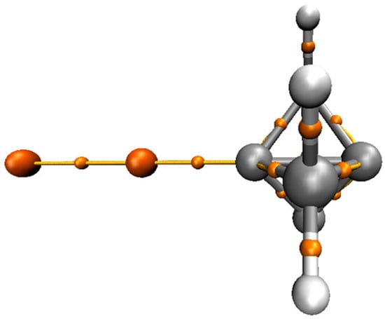 Figure 3 shows the AIM diagrams of P-Cu2. A bond critical point (BCP) was present between the Cu atom and the bridgehead C atom of P, confirming the existence of a coinage-metal bond. The topological parameters at the BCP, including electron density, Laplacian, and total energy density, were collected in Table 2. The electron density ranging from 0.07 to 0.121 a.u. is partly out of the range suggested for non-covalent interactions [39]. Although the M⋅⋅⋅C BCP is different due to the M atom, its electron density had a consistent change with the interaction energy for each series of the complex. For the same M⋅⋅⋅C BCP, the electron density in P-MCl was larger than that in the P-M2 analogue. The electron density at the Au⋅⋅⋅C BCP in P-AuCH3 was smaller than that in P-Au2, while an opposite result is found for the electron density at the Ag⋅⋅⋅C BCP. Even so, both variations were consistent with the interaction energy. Therefore, the electron density could be used to estimate the strength of the coinage-metal bond. The value of Laplacian was in a range of 0.18 to 0.28 a.u., which was also out of the range suggested for non-covalent interactions [39]. This further confirms the existence of a strong coinage-metal bond.