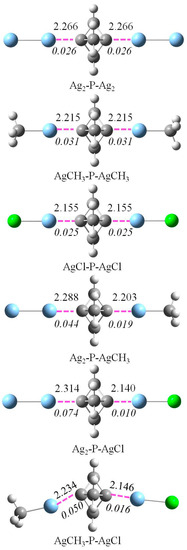 Figure 4 shows the optimized structures of six ternary systems of Ag2-P-Ag2, AgCH3-P-AgCH3, AgCl-P-AgCl, Ag2-P-AgCH3, Ag2-P-AgCl, and AgCH3-P-AgCl, which were used to study the cooperativity of the coinage-metal bond. Only the Ag ternary systems are discussed since most Cu and Au counterparts have imaginary frequencies. The binding distance showed a similar change in the different series of ternary systems. Namely, the binding distance in the ternary system was longer than that in the binary analogue. If the coinage donor was the same in the ternary system, both interactions would have an equal elongation. Moreover, this elongation became larger from AgCl-P-AgCl to Ag2-P-Ag2 to AgCH3-P-AgCH3. When the coinage donor was different in the ternary system, both interactions had an unequal elongation. Furthermore, this elongation was larger for the weaker coinage-metal bond. For example, this elongation was 0.016 Å for the stronger P-AgCl interaction but 0.050 Å for the weaker P-AgCH3 interaction.