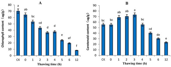 Changes in chlorophyll (A) and carotenoid contents (B) in “Ruaner” pear during the freezing–thawing stage. Different letters indicated significant differences between thawing time treated and control (Duncan’s multiple range test, p < 0.05).