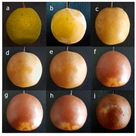 Photographs of “Ruaner” pear during the freezing–thawing stage (a) ck, (b) 0 hours after thawing (HAT), (c) 1 HAT, (d) 2 HAT, (e) 3 HAT, (f) 4 HAT, (g) 5 HAT, (h) 6 HAT, (i) 12 HAT.