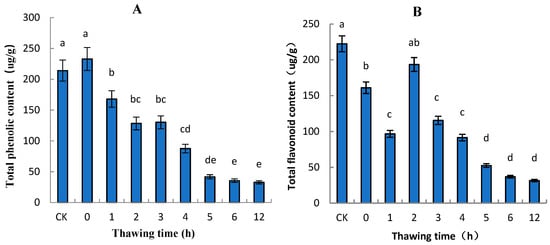 Changes in total phenolic (A) and flavonoid content (B) in “Ruaner” pear during the freezing–thawing stage. Different letters indicated significant differences between thawing time treated and control (Duncan’s multiple range test, p < 0.05).