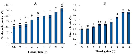 The change in soluble solids content (SSC) (A) and titratable acidity (TA) (B) content in “Ruaner” pear during the freezing–thawing stage. Different letters indicated significant differences between thawing time treated and control (Duncan’s multiple range test, p < 0.05).