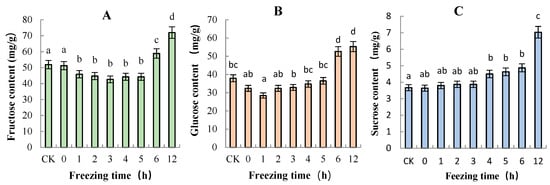 Changes in soluble sugar (A: fructose, B: glucose, C: sucrose) content in “Ruaner” pear during the freezing–thawing stage. Different letters indicated significant differences between thawing time treated and control (Duncan’s multiple range test, p < 0.05).