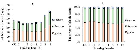 Changes in total soluble sugar content (A) and percentage composition of soluble sugars (B) in “Ruaner” pear during the freezing–thawing stage.
