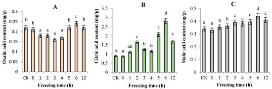 Changes in organic acid (A: oxalic acid, B: citric acid, C: malic acid) content in “Ruaner” pear during the freezing–thawing stage. Different letters indicated significant differences between thawing time treated and control (Duncan’s multiple range test, p < 0.05).