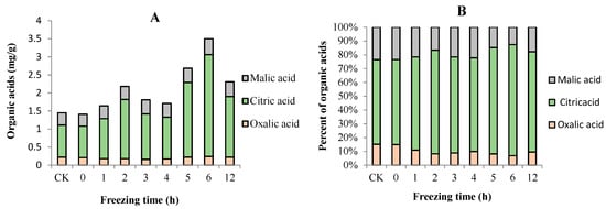 Changes in total organic acid content (A) and percentage composition of organic acids (B) in “Ruaner” pear during the freezing–thawing stage.